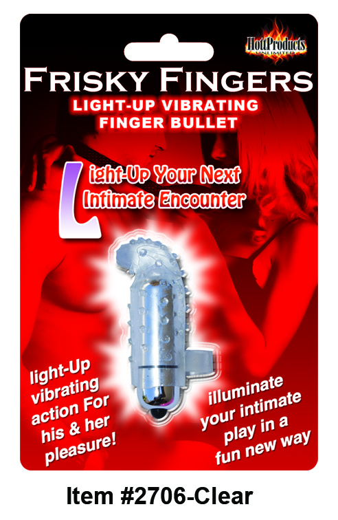 Light Up Frisky Finger Vibrator is available in two colors: Clear and Magenta. Each sold separately. Do you want to play? Feeling a little frisky? You will be with the Frisky Fingers Finger Vibes! Slips on to any finger to sooth and caress your most intimate regions, in the dark of night!. Light up your next encounter. Light up action for his and her pleasure. These fun little finger vibes not only caress your most intimate regions into erotic bliss, but also will Illuminate your intimate play in a fun new way which will have you exploring your most intimate sexual desires like never before! Super soft sensuous silicone with raised nubbies to vibrate you into an erotic frenzy! Waterproof, with inter-changeable batteries. TPR sleeve, ABS plastic bullet. Light Up Frisky Finger Vibrator from Hott Products Unlimited.
