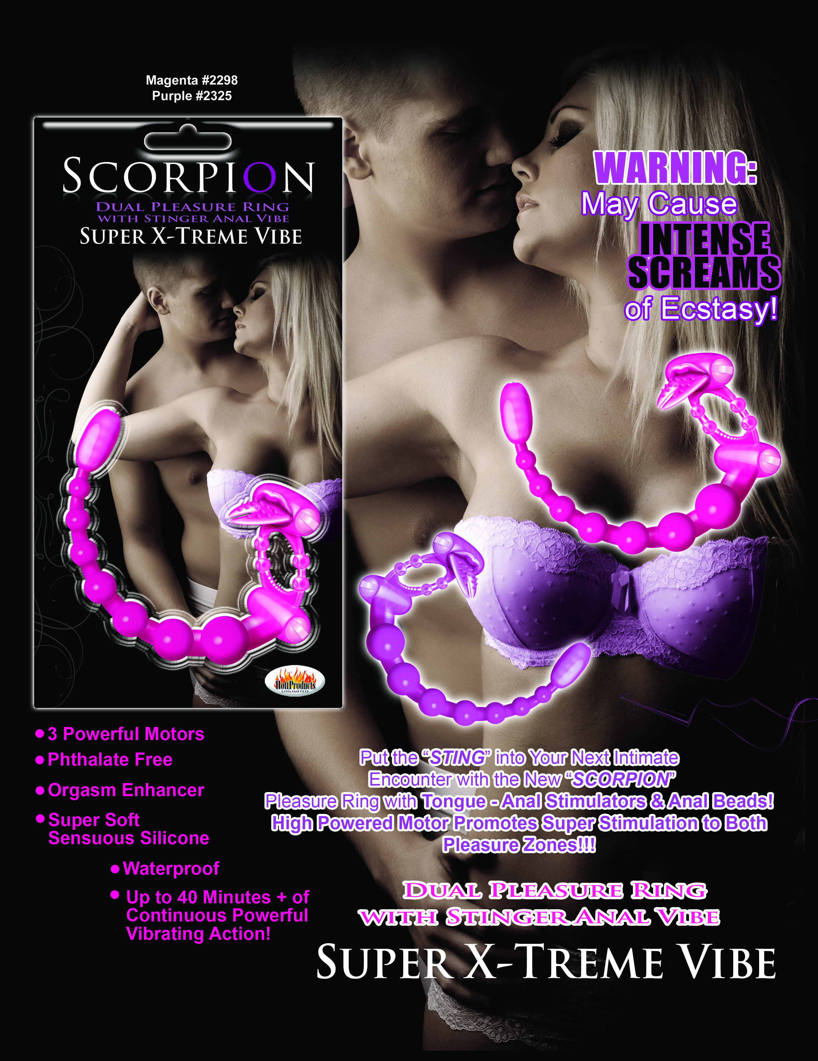 Super Xtreme Vibe Scorpion with stinger anal vibe is available in two colors: Magenta and Purple. Each sold separately. Please and tease your partner into sexual bliss with the scorpion pleasure ring! Pamper your lover into an erotic frenzy! Vibe is made using super soft sensuous Silicone. Three super powerful motor, up to 40 minutes + of powerful vibrating pleasure! Interchangeable batteries. Orgasm enhancer. Waterproof for play outside the bedroom. Phthalate Free. One size fits all. Colors may vary. Super Xtreme Vibe Scorpion Magenta from Hott Products Unlimited. New image added February 9, 2013.